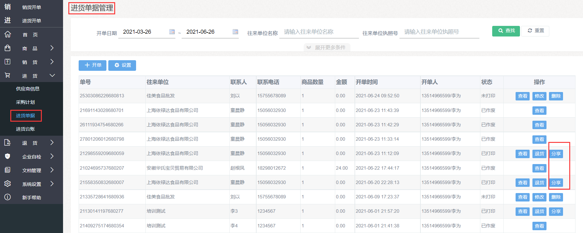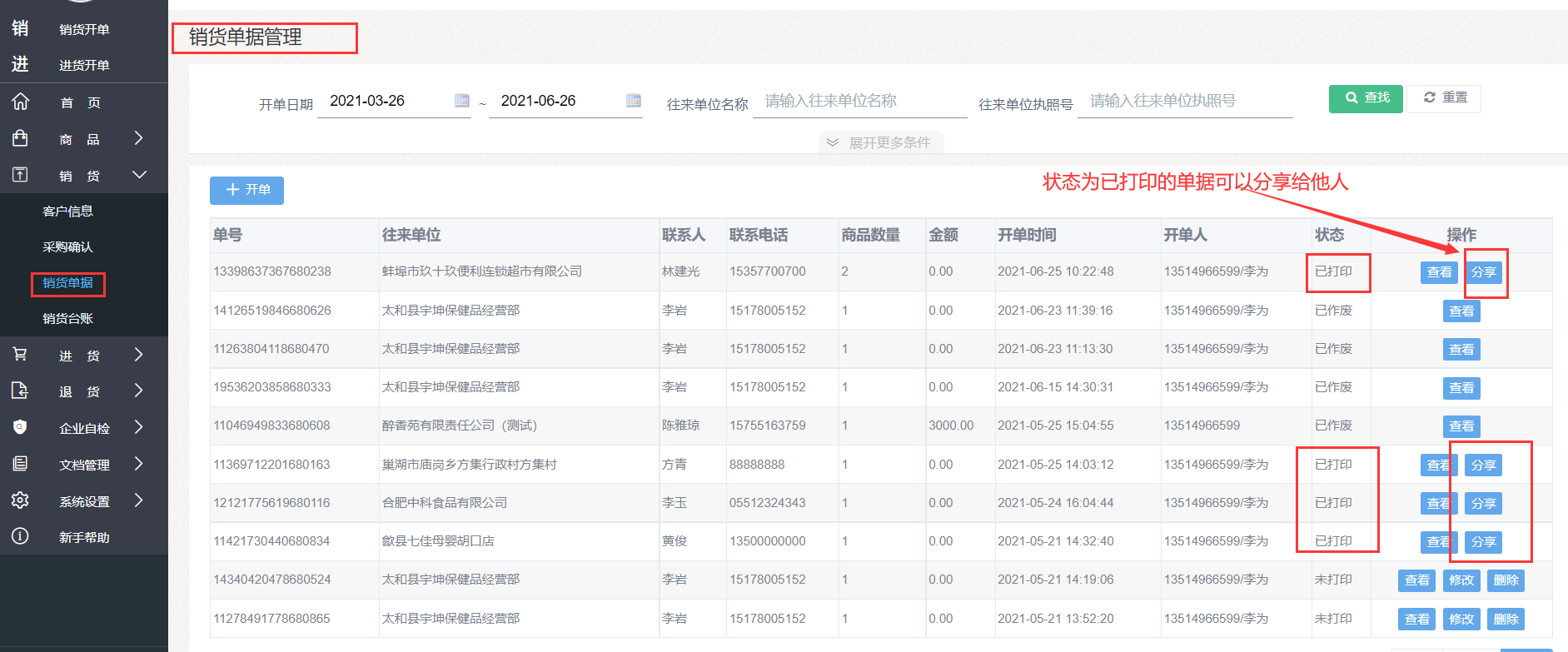 已打印或已生成台账的单据(状态为已打印)可以分享电子单据给您的客户。在销货(进货)单管理页面,点击“分享”可以通过微信或QQ分享给对方。