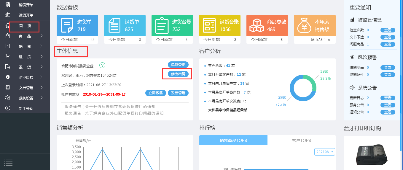 点击首页面主体信息内的“修改密码”,可以修改当前登录用户的登录密码