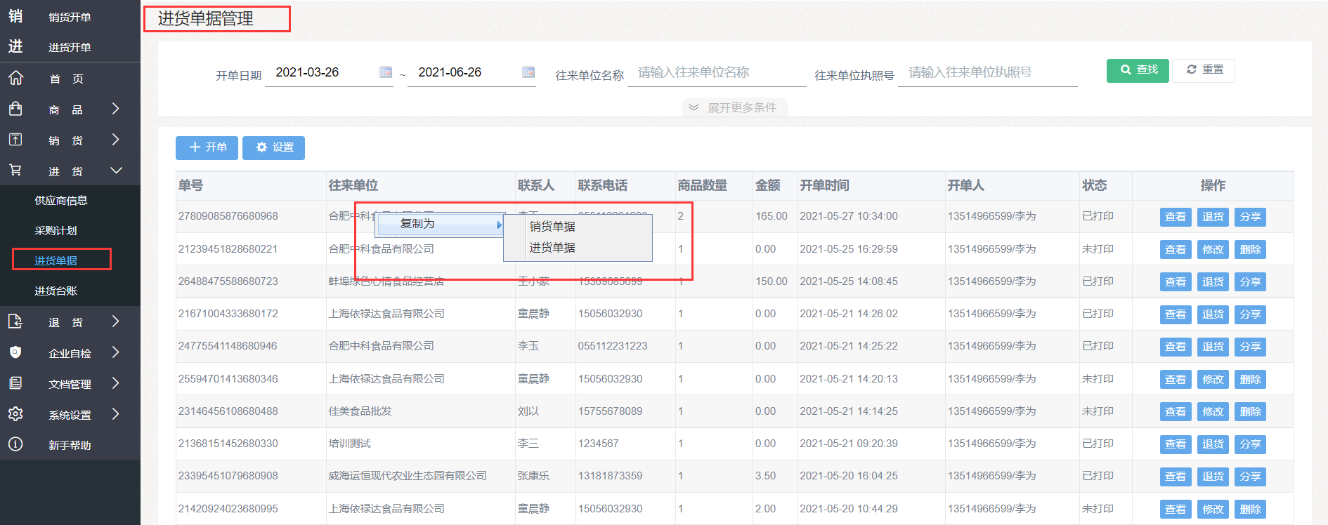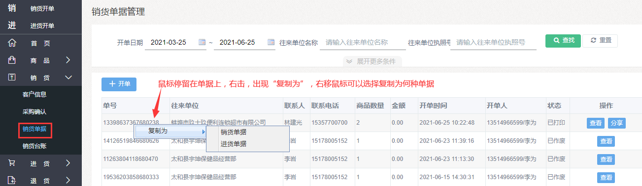 操作方法:在被复制单据上右击鼠标,点击“复制为”选择单据类型,原单据的所有商品信息将被复制到新单据中,您只需要选择往来单位并更改相关信息即可完成开单。