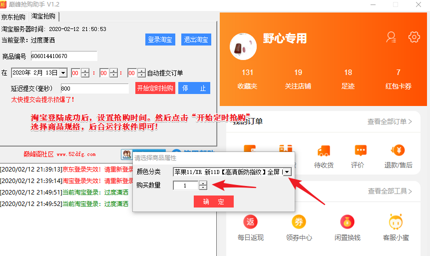 ## 淘宝登陆成功后,设置抢购时间。然后点击“开始定时抢购”