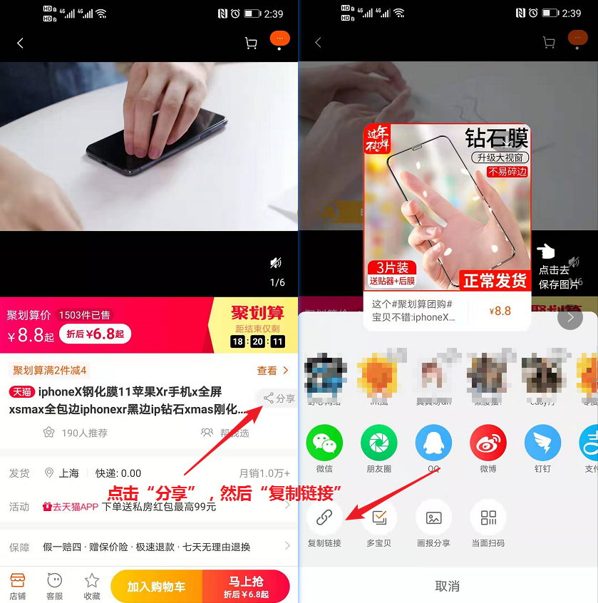 首先在淘宝商品详情页,点击"分享"。然后“复制链接"