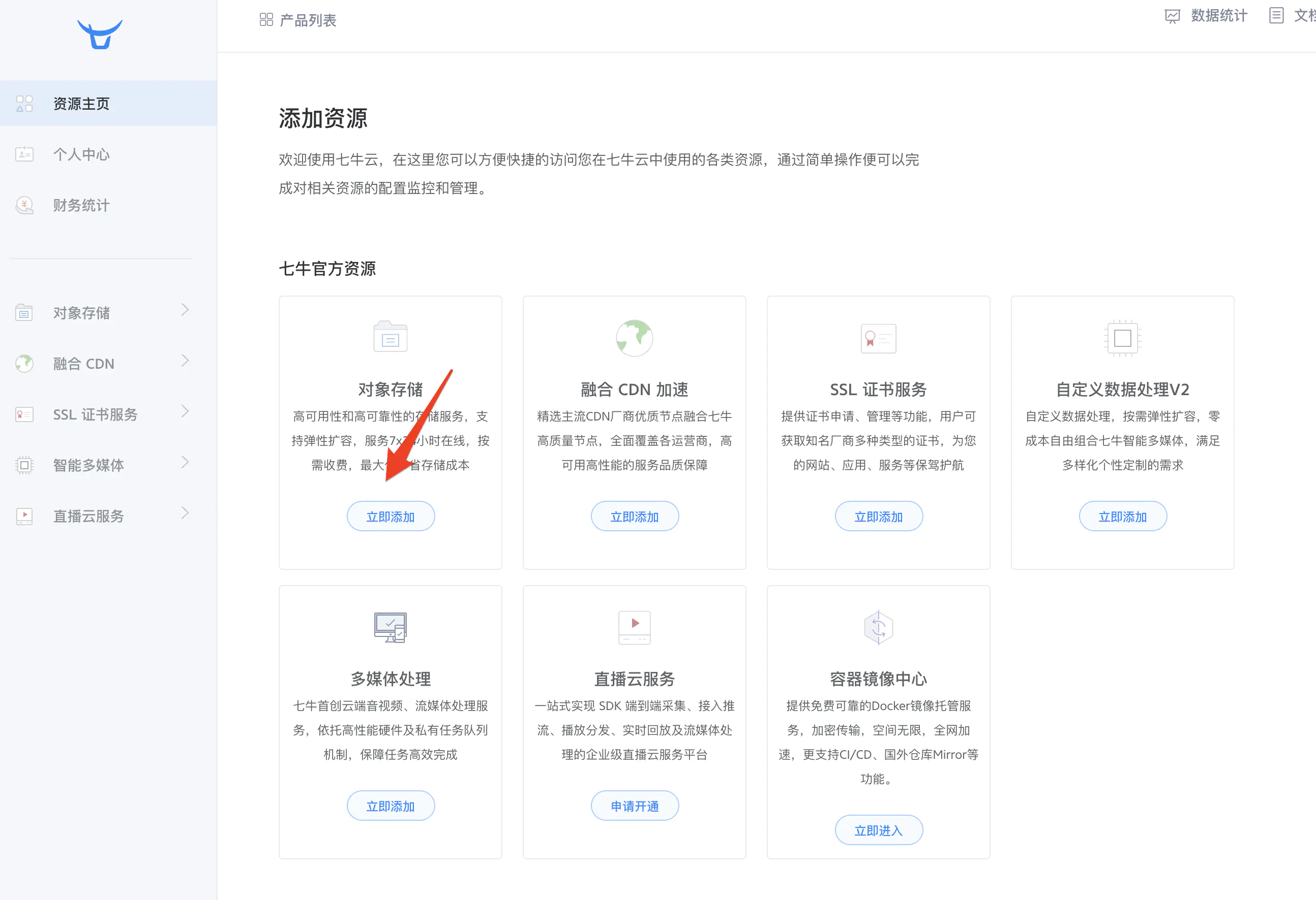 ### 2、创建对象存储,进入到主面板中,点击创建对象存储
