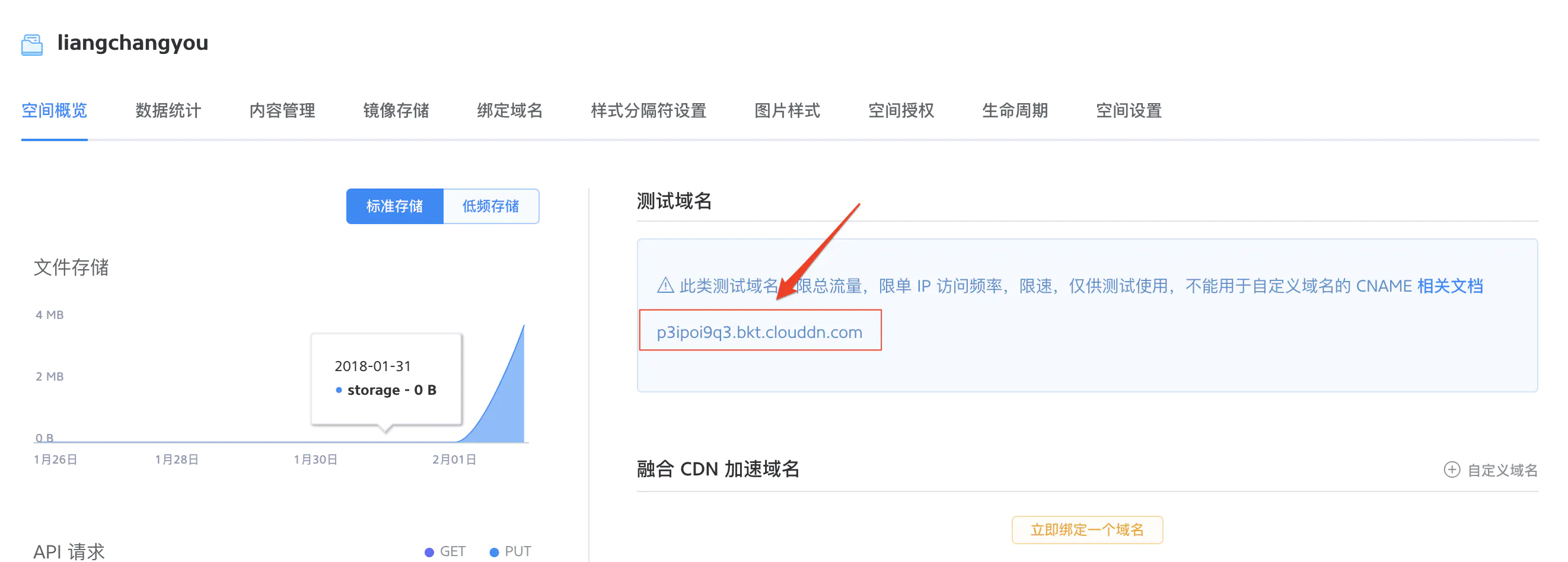 * 打开刚刚创建的**liangchangyou**资源,复制**测试域名**中的域名至 iPic 的 Http 前缀中。要注意格式的完整,比如*[http://p3ipoi9q3.bkt.clouddn.com/](https://link.jianshu.com/?t=http://p3ipoi9q3.bkt.clouddn.com/)*就是格式完整的 Http 前缀。