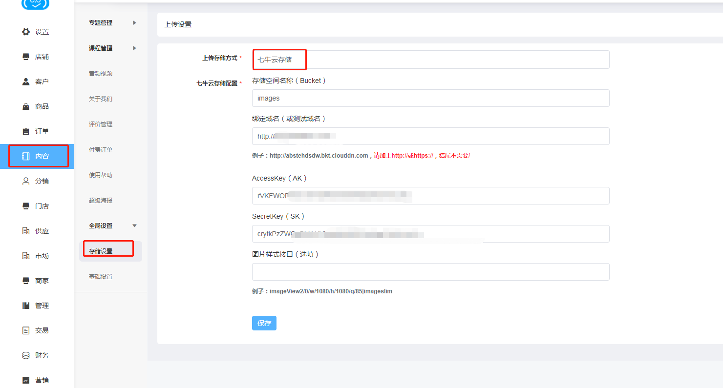 ### 5、登录后台【内容】-【全局设置】-上传存储方式-选择七牛云存储-配置对应参数