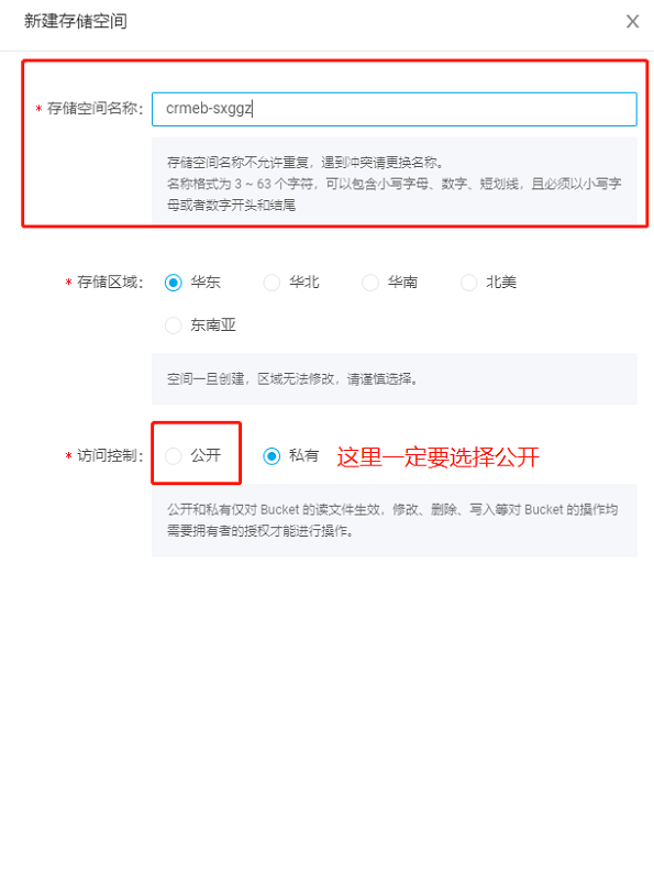 * 点击后,进入下面的界面中,按要求填写就可以了,存储空间名称可以随便填写