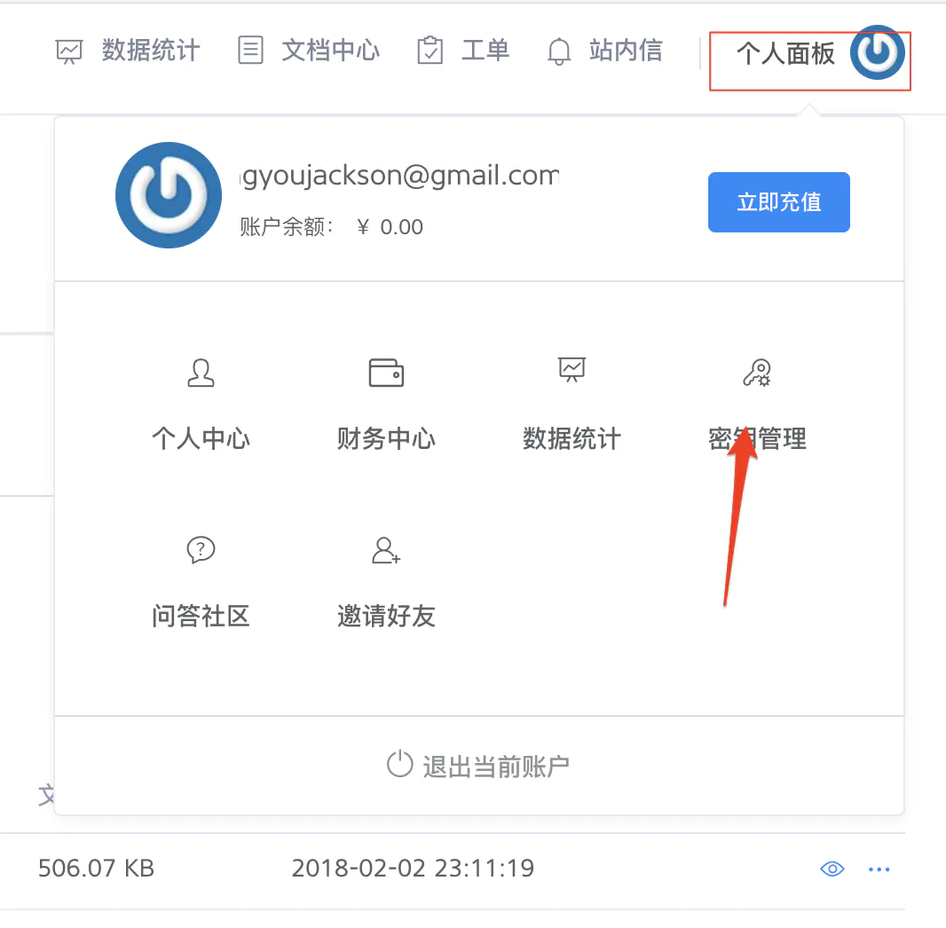 * 进入`个人面板`\=>`密钥管理页