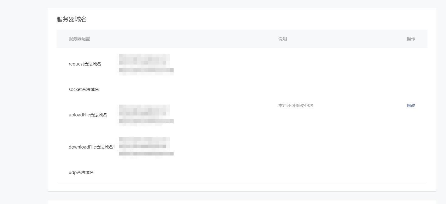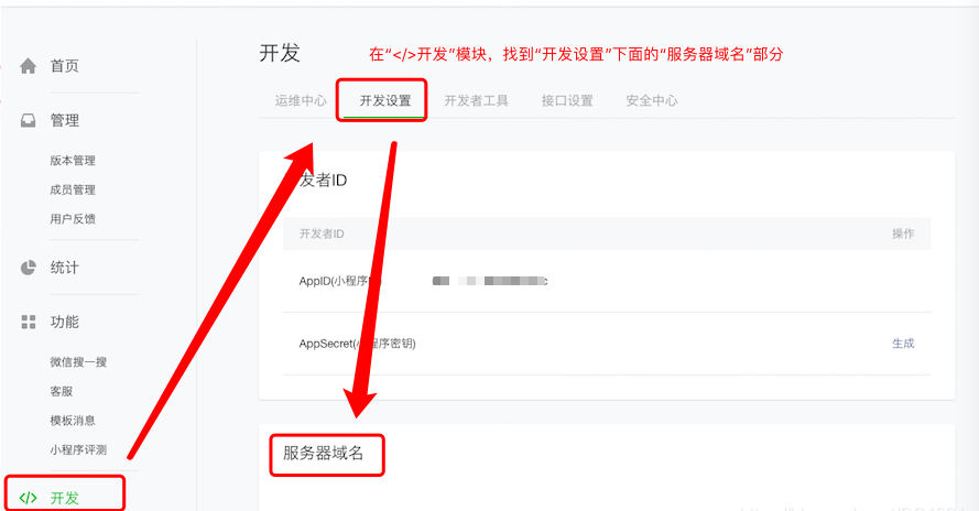 登录小程序公众平台-在“开发”模块,找到“开发设置”选项,下拉找到“服务器域名”模块。