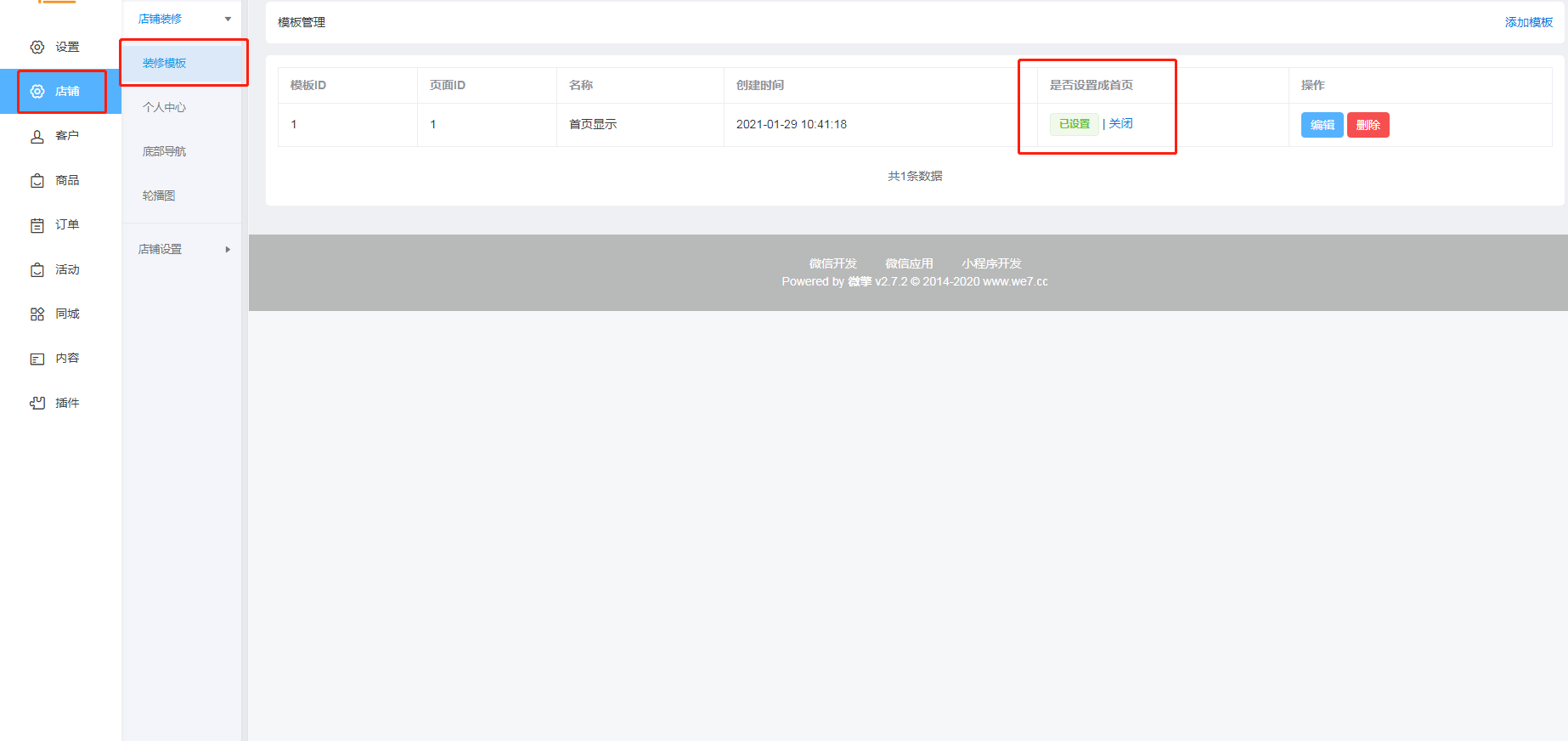 后台-装修模板-检查一下是否有设置开启使用