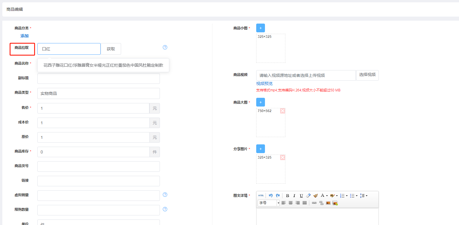 操作:在后台-点击"商品"-"新增商品"-点击"商品拉取”,-输入自营平台已上架商品名称点击获取