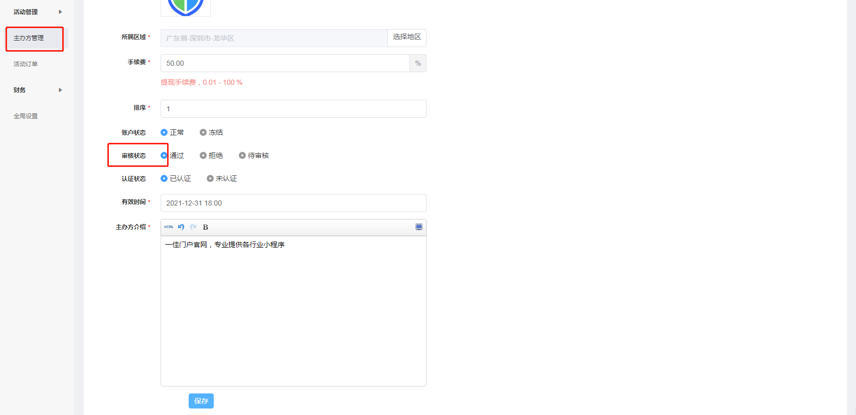 小程序申请主办方的用户,需要在主办方列表审核通过主办方