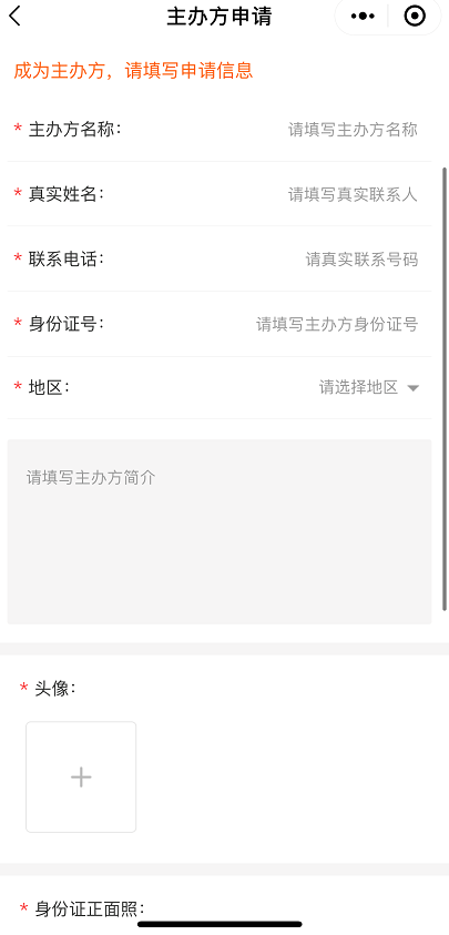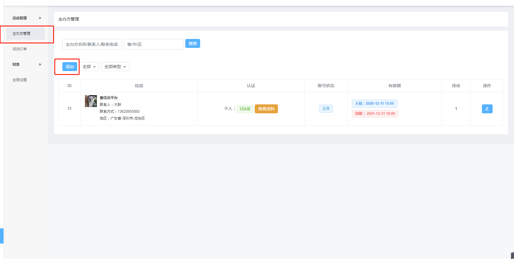 添加主办方:也可以在后台添加主办方,主办方也可以在小程序申请入驻,入驻路径(个人中心菜单—主办方中心)