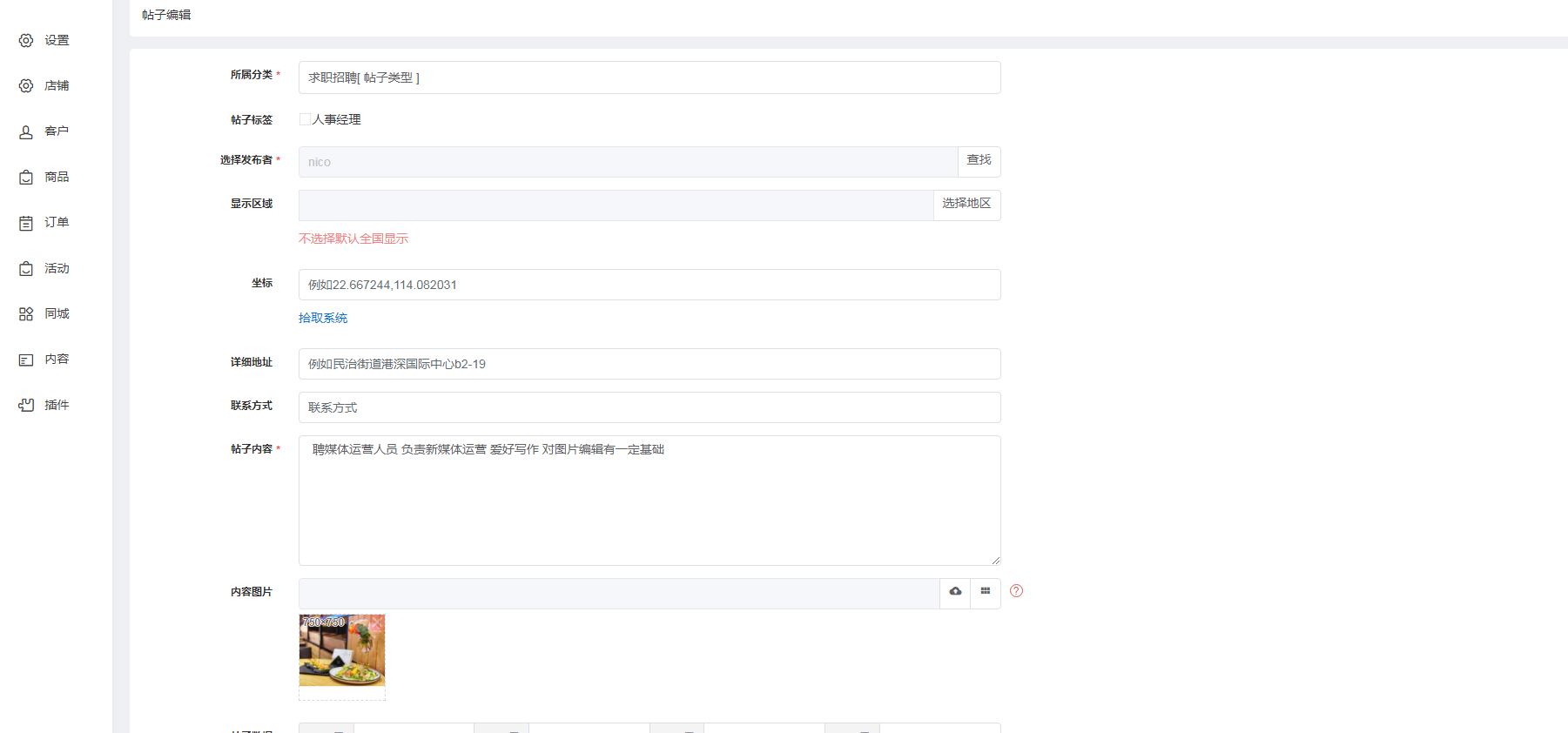 设置分类、发布人、发布头像、联系电话、地址、帖子内容、图片、浏览量、是否置顶、到期时间,所属城市。