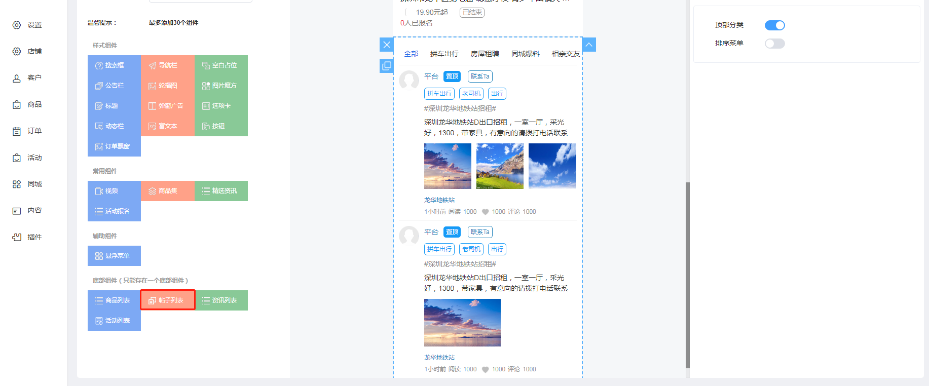 帖子列表:平台帖子列表组件,用户可以通过该组件查看平台的帖子信息;顶部可设置分类选择