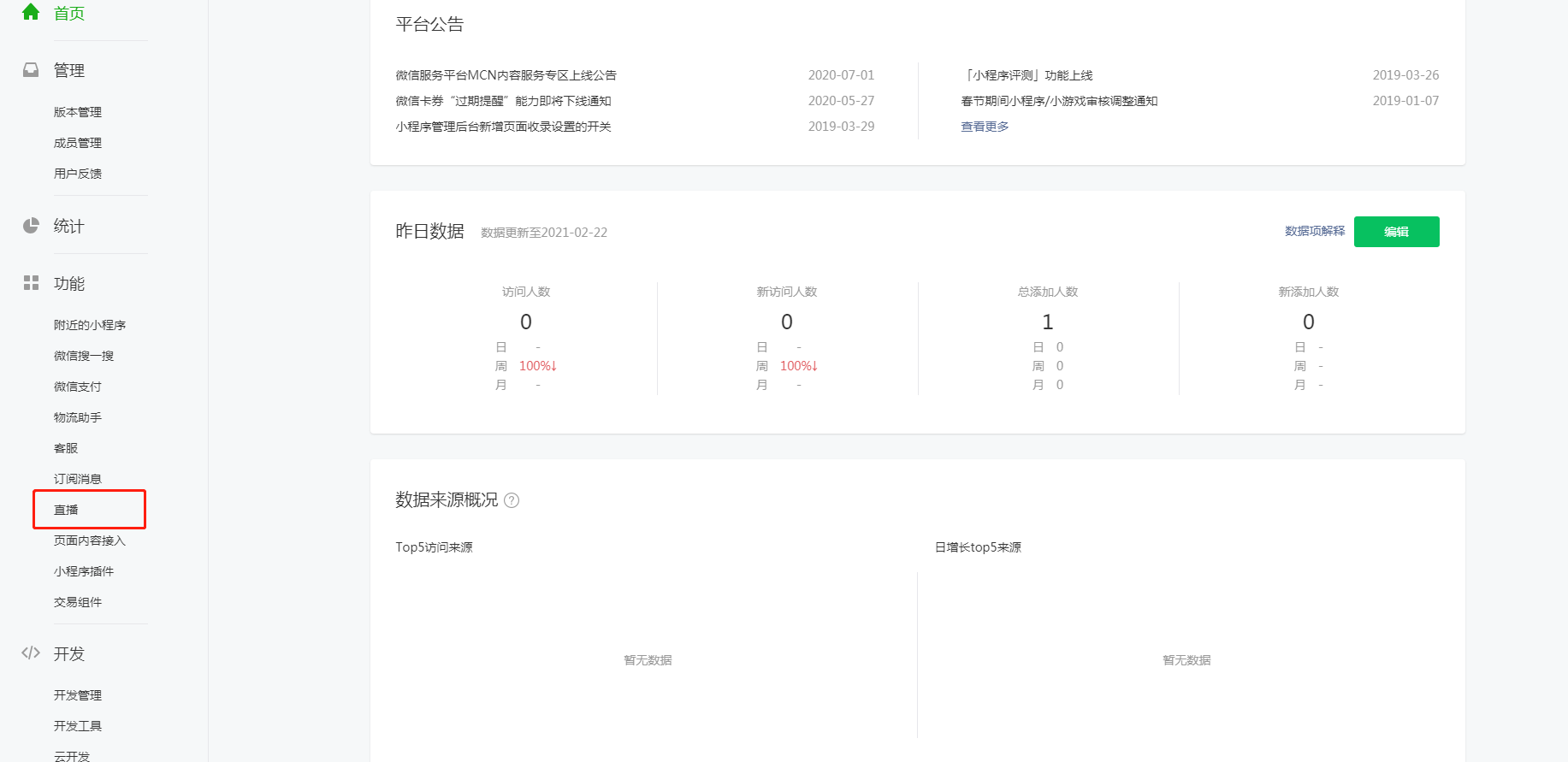 1)登录【小程序公众平台】[https://mp.weixin.qq.com/](https://mp.weixin.qq.com/))”([mp.weixin.qq.com](http://mp.weixin.qq.com/)),在左侧导航栏找到“小程序—功能—直播