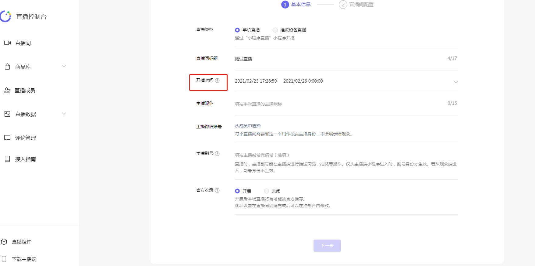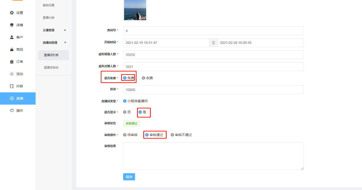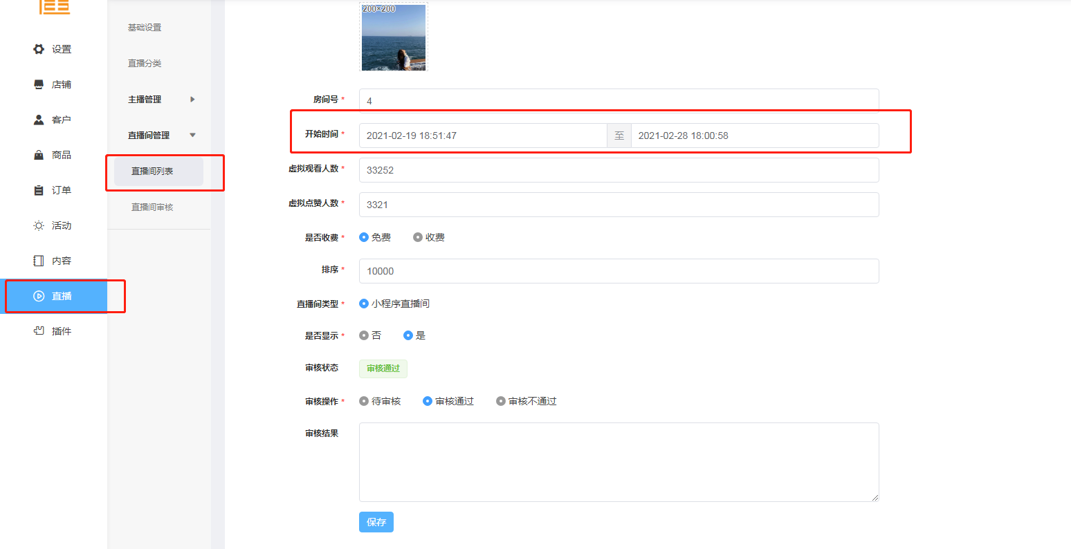 开播时间跟结束时间要跟小程序公众平台这边是时间一致
