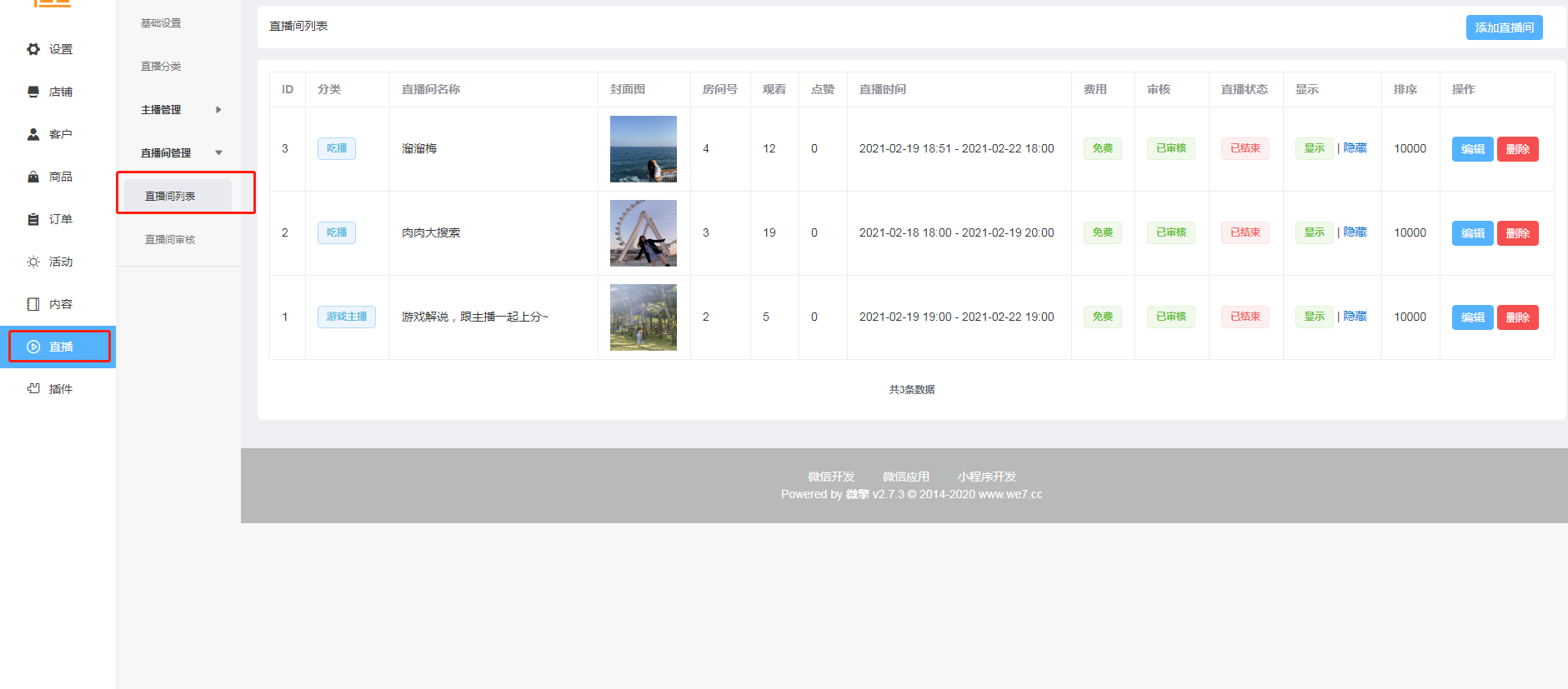 查看直播间列表,可对直播间进行隐藏、编辑等:
