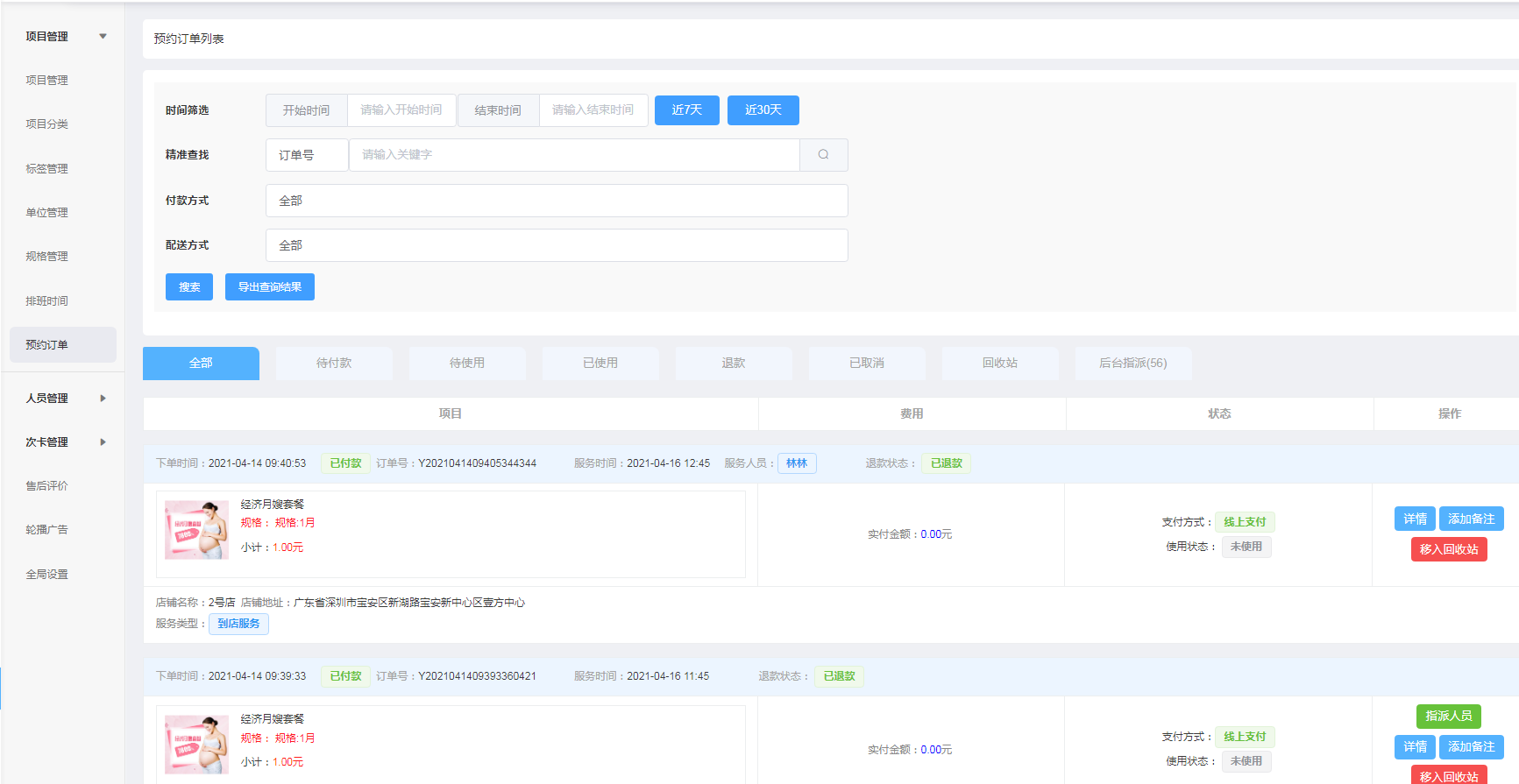 7、预约订单:查看平台所有预约订单,状态,查询订单,是否使用(可在后台直接核销订单)