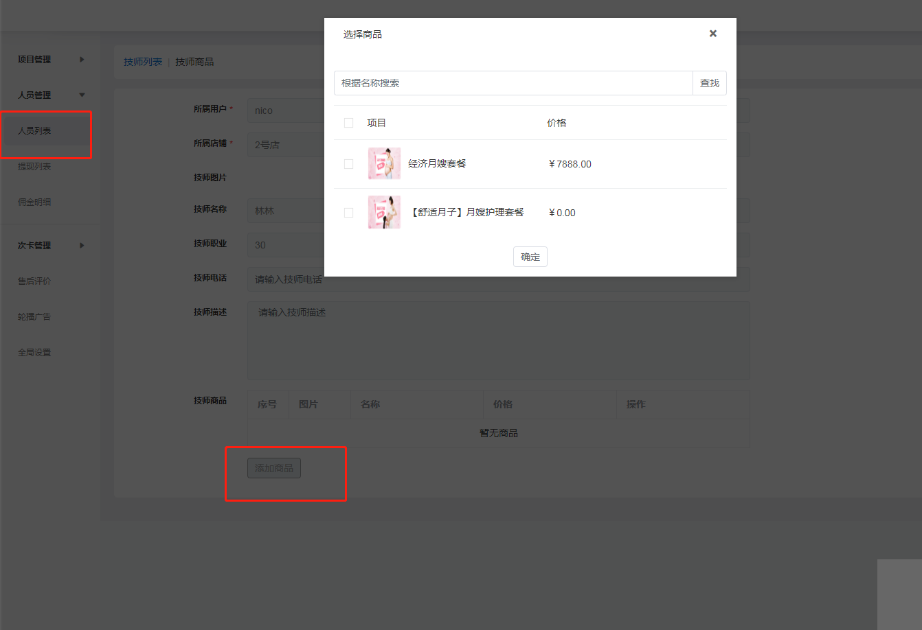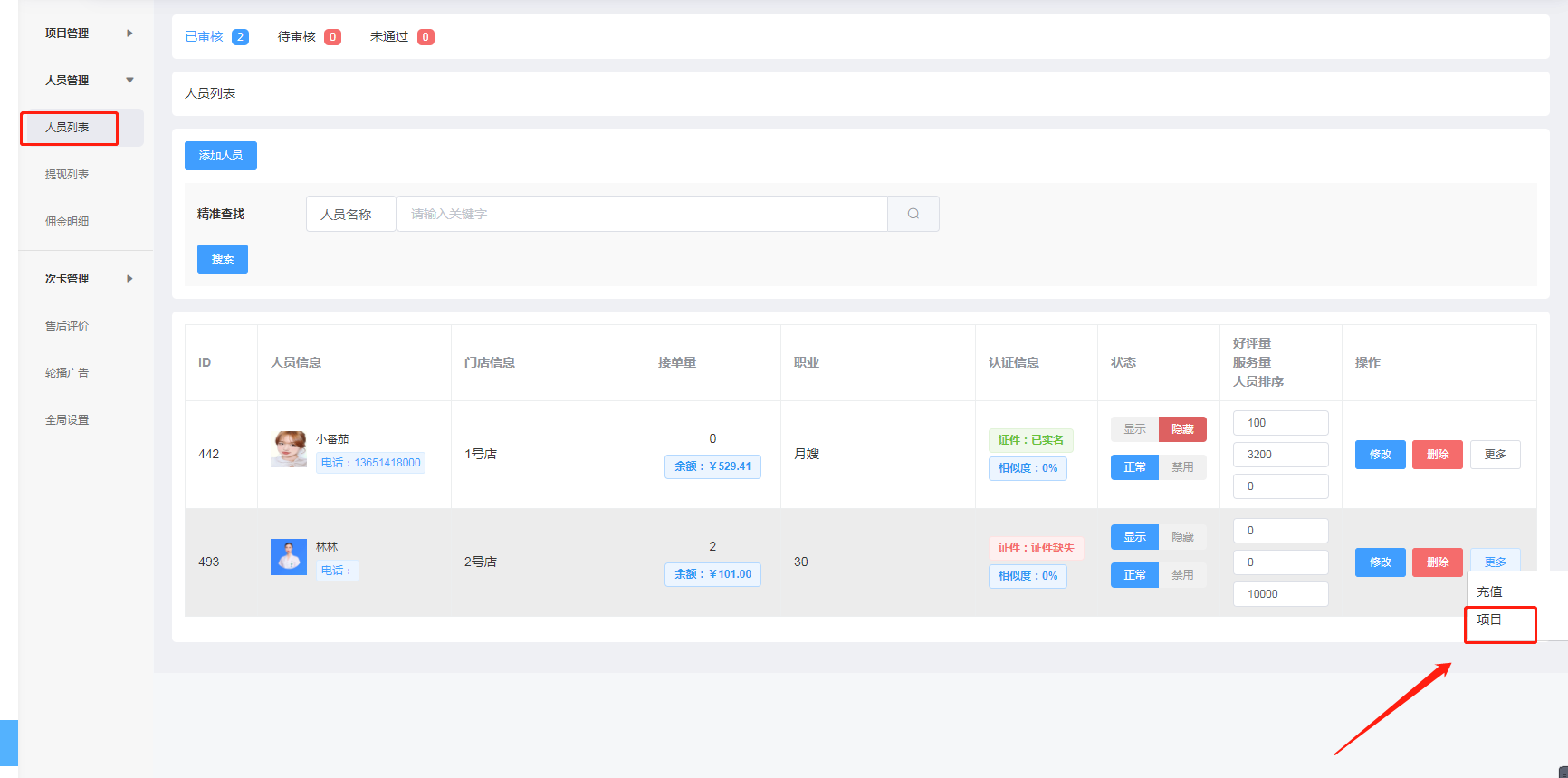 1)操作路径:人员列表——更多按钮——点击项目——选择人员的服务项目