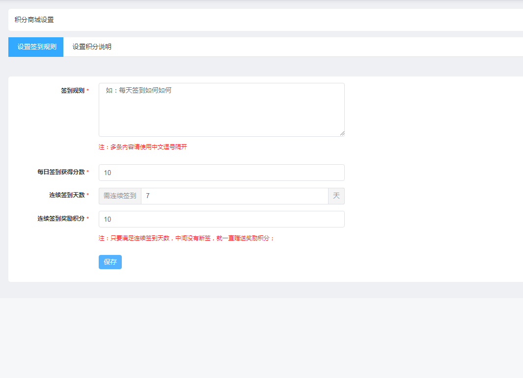 * 连续签到几天额外得的积分数:自定义设置连续签到多少天获得额外积分数