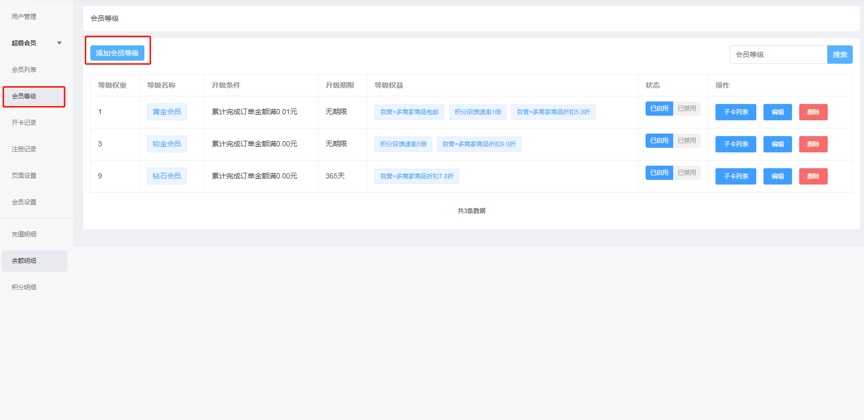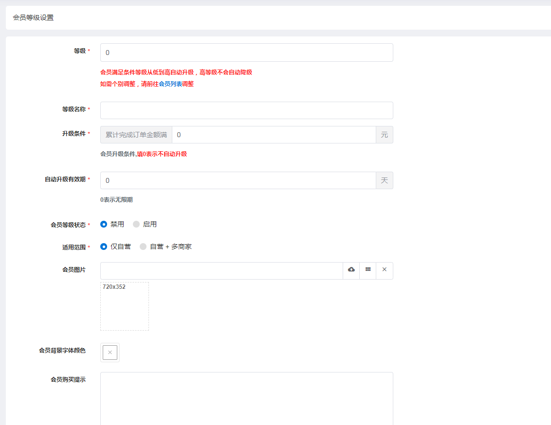 * 等级权重:会员满足条件等级从低到高自动升级,高等级不会自动降级,0级默认最低级