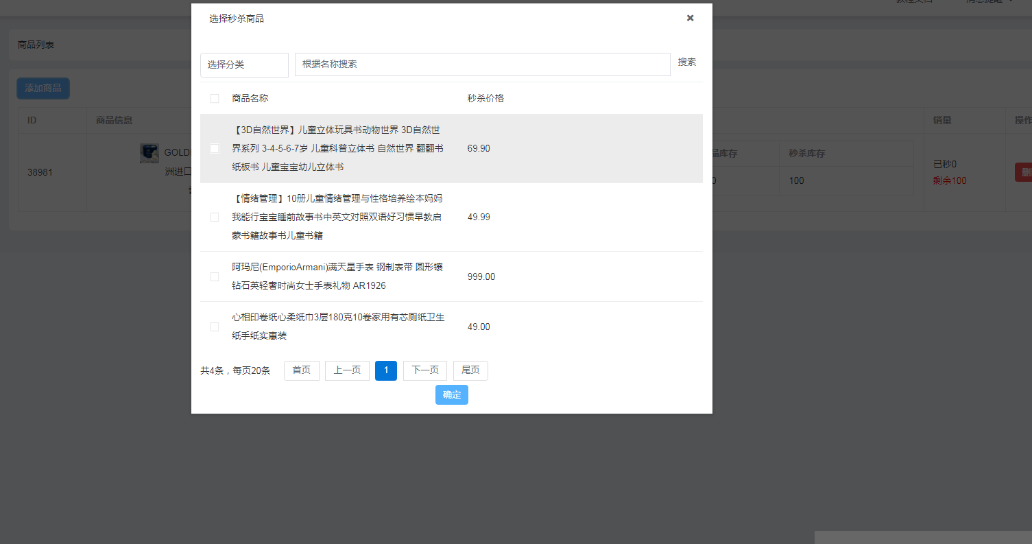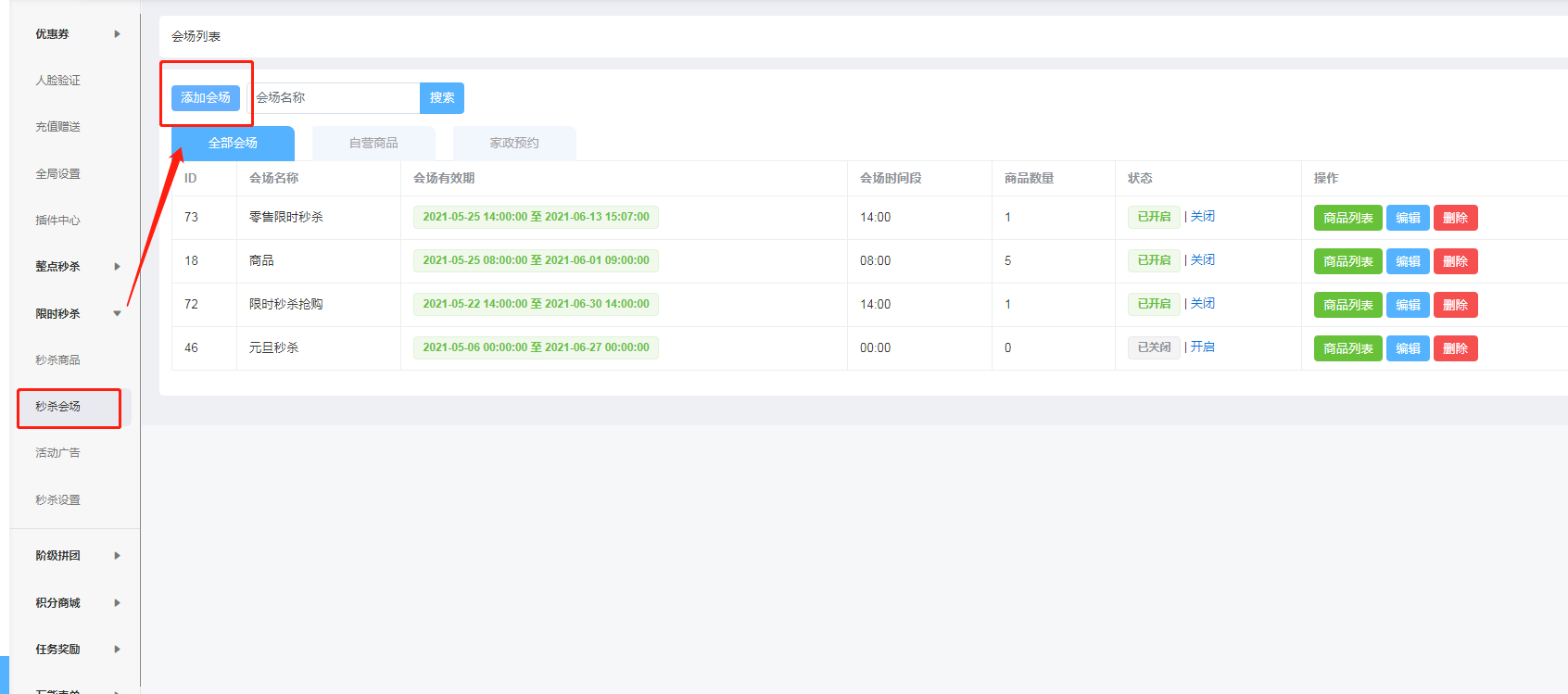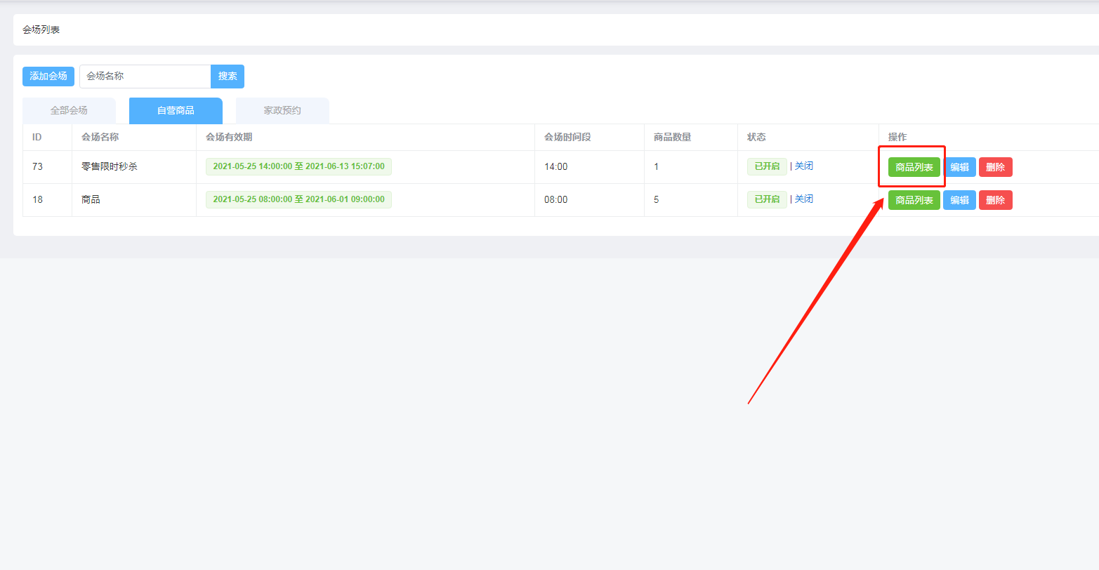 * 添加会场支持秒杀商品:点击会场列表右侧按钮【添加商品】