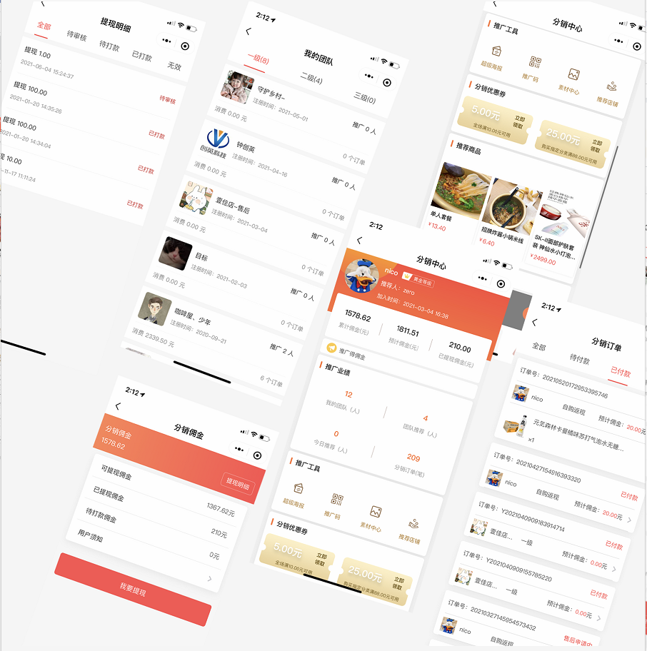 * #### 推广业绩:数据面板自动统计展示分销商用户的推广人数,分销订单笔数等;