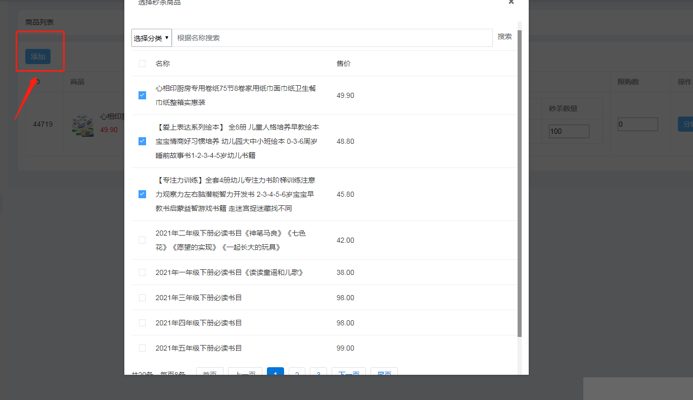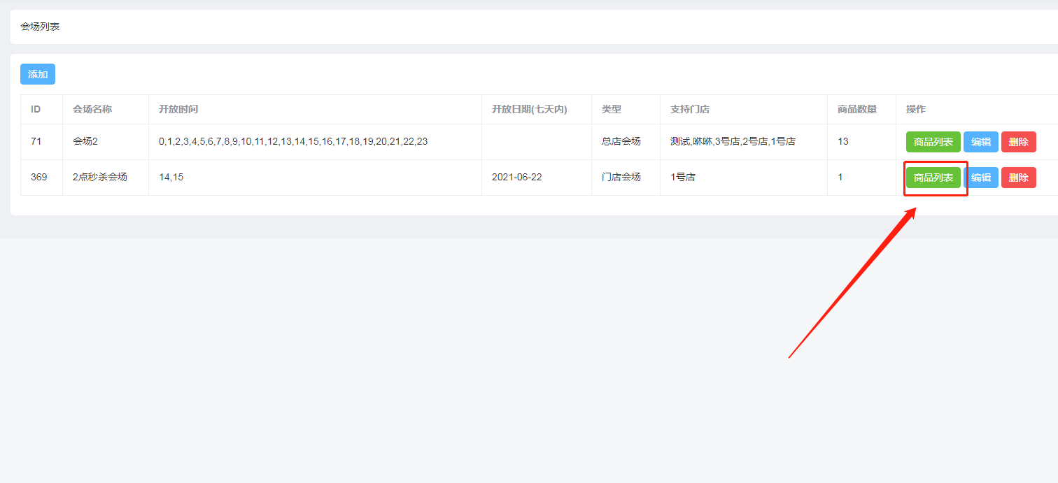 2、添加整点秒杀商品设置:点击会场列表点击【商品列表】—点击【添加】商品