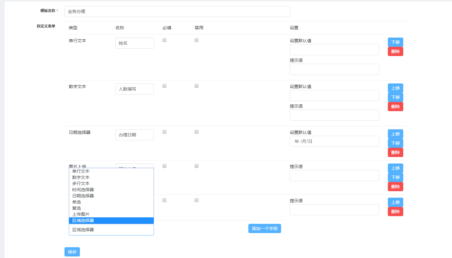 默认值:表单模板需要输入的字段可设置默认文字