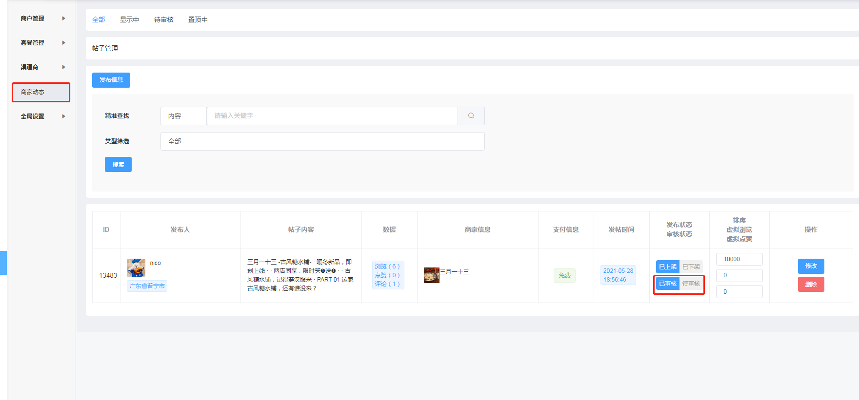 ### 6\. 商家动态设置:开启发布商家状态审核按钮,如商家发布动态平台需要审核才显示在商家动态主页,审核在(后台—商家—商家动态—审核状态)