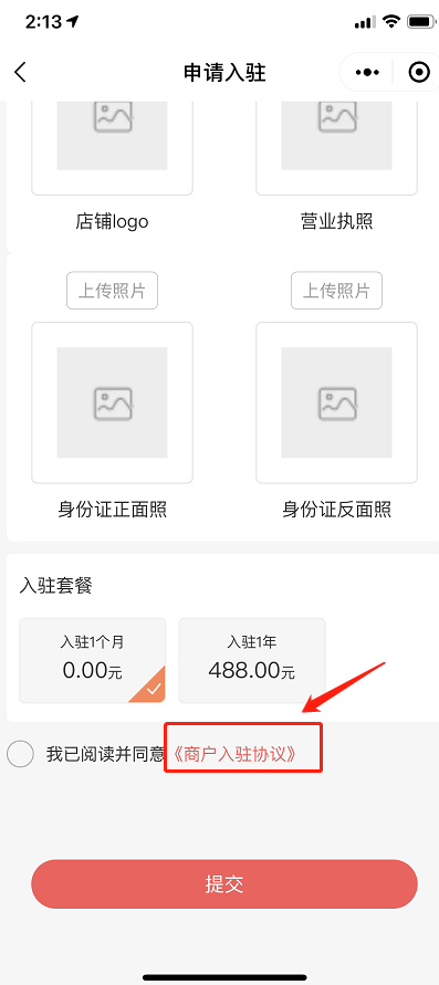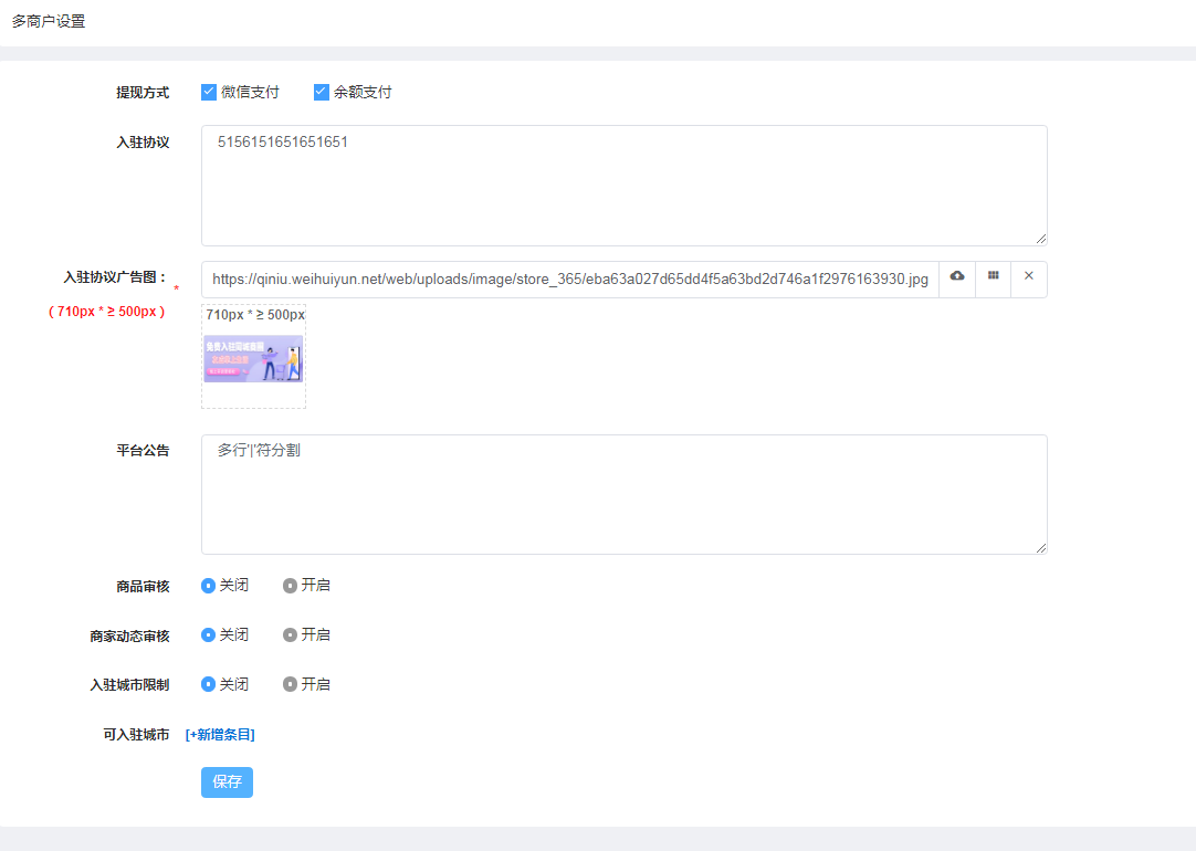### 2\. 入驻协议:平台填写入驻协议文本款,商户入驻时可以查看入驻内容