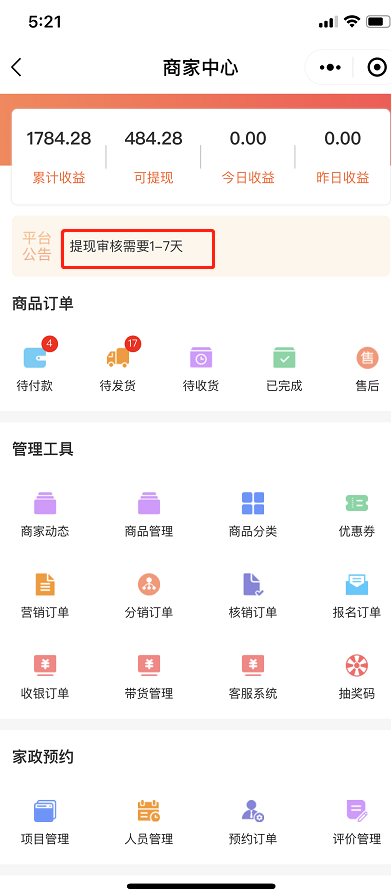 ### 4\. 平台公告:商户入驻之后在【商家中心】显示的平台公告,给商家看公告内容