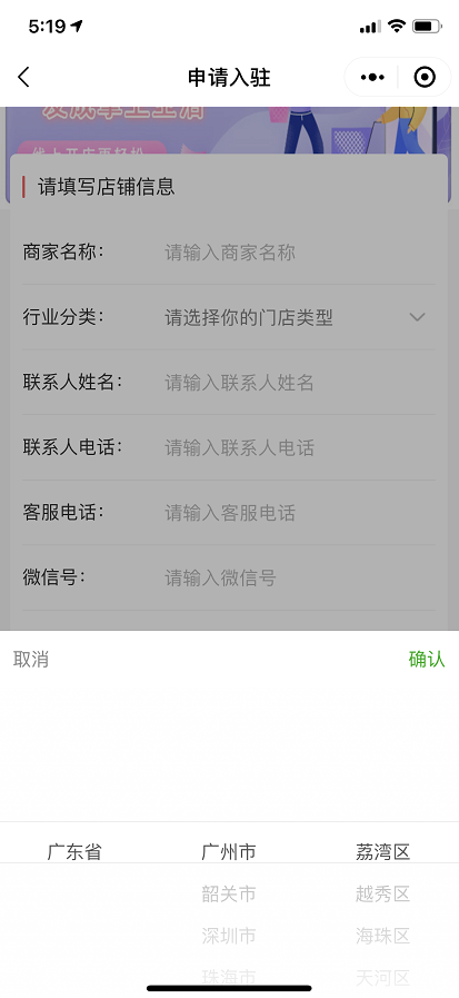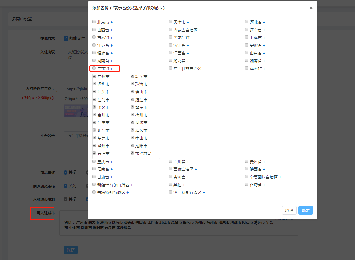 ### 7\. 入驻城市:平台可设置限制城市入驻,如设置了只限深圳市入驻,商户在入驻时就只能选择广东省,其他城市入驻不了