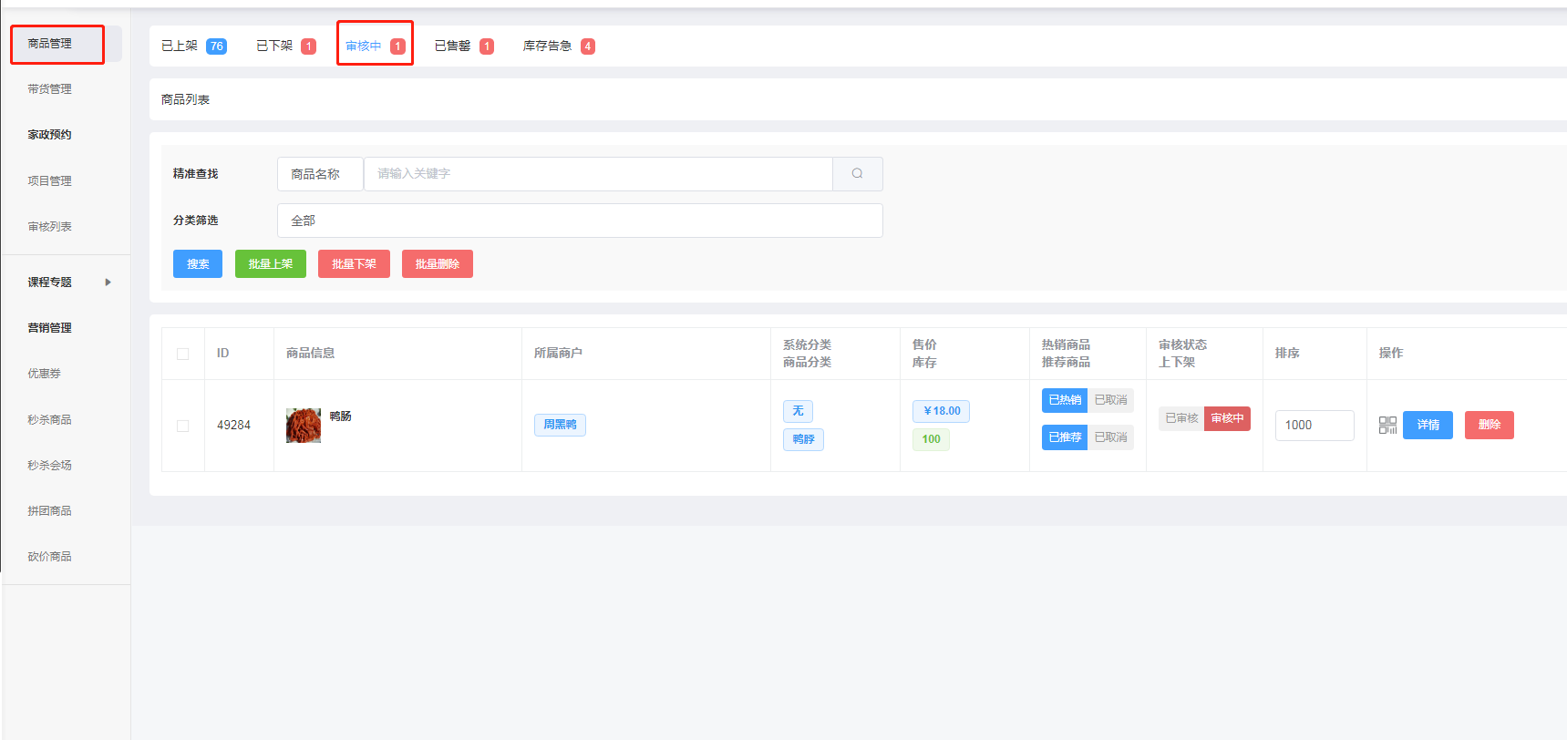 ### 5\. 商品审核:商户上架产品是否审核按钮,如平台开启审核商户上架商品在(后台—管理—商品列表—审核中,审核商品)审核通过,没有审核通过的产品,商家不可上架售卖