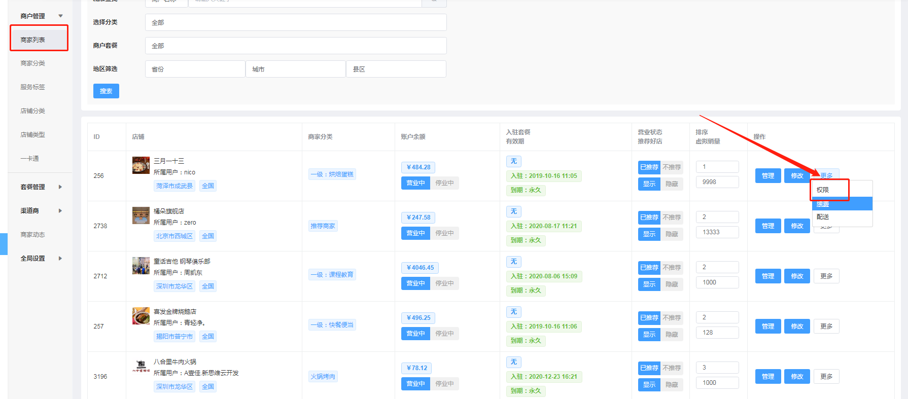 设置入口:商家—商家列表—【更多】按钮点击【权限】
