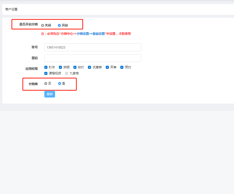 商户设置开启是否分销,给商户开启分销要先【分销模块】设置基础信息才可使用
