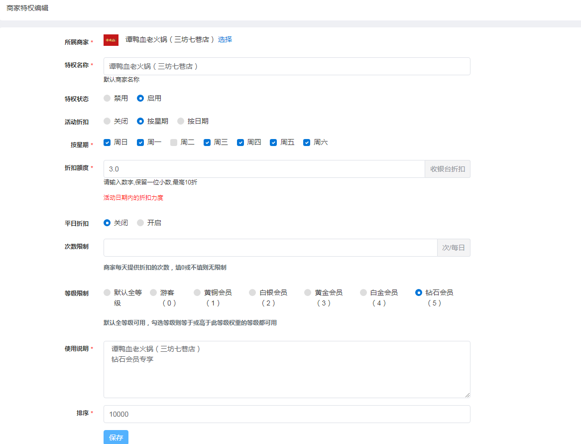 * 等级限制:默认全等级可用,勾选等级则等于或高于此等级权重的等级都可用(如:只勾选黄金等级,只有黄金等级用户享受折扣)