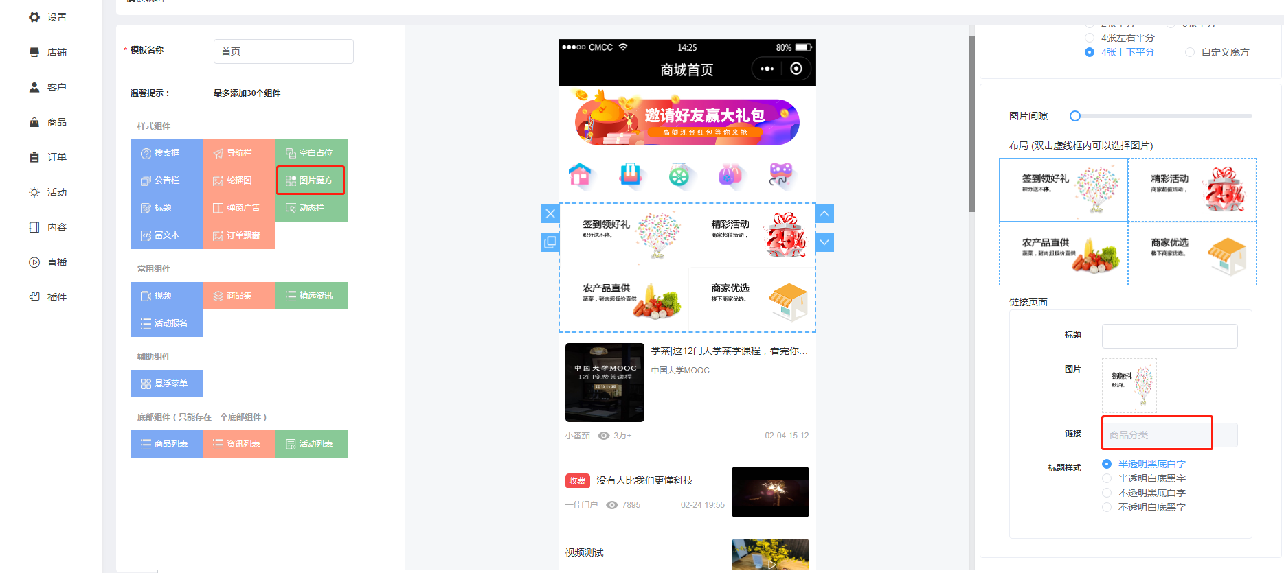 魔方属于可自定义功能,可以能在海报或者图片上,设置链接到自定义页面地址。