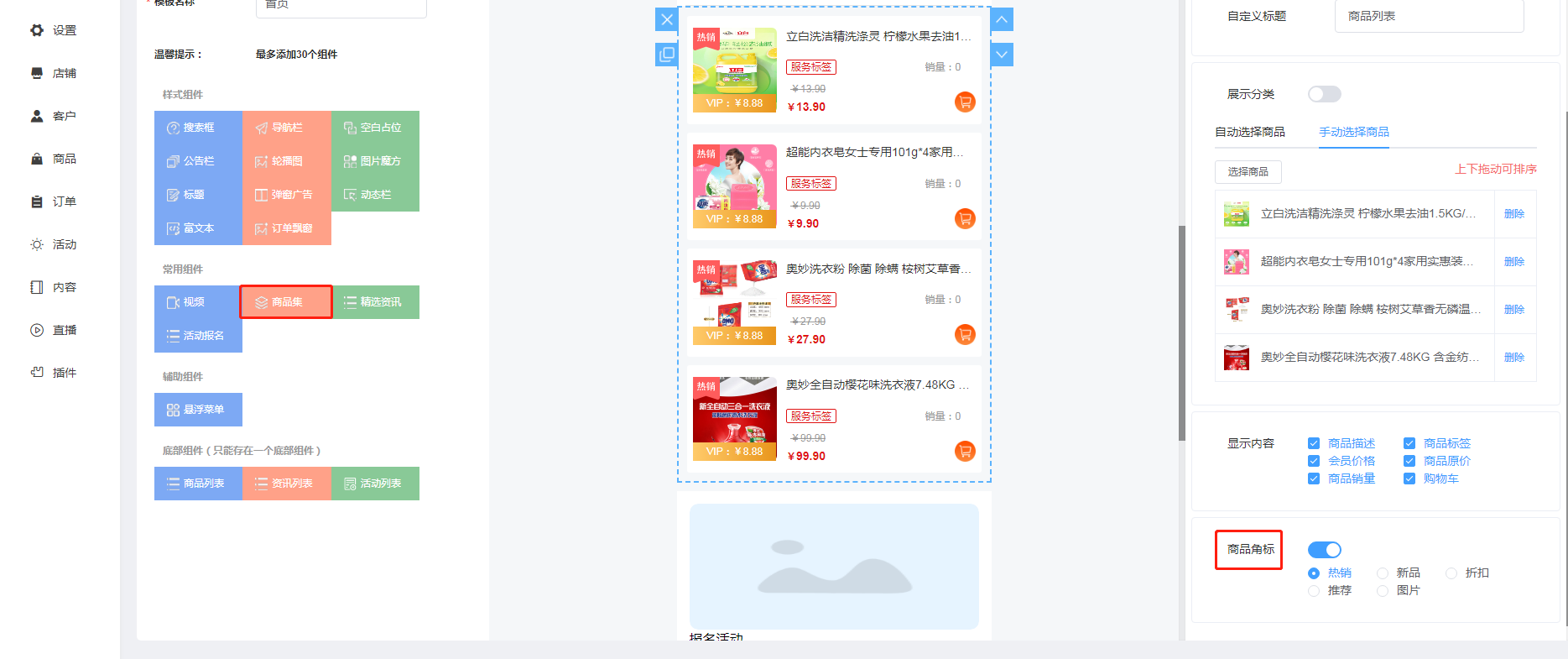 在新建或编辑装修页面时,在组件中选择“商品集”组件,您可以选择系统默认的商品角标,如:"热销"、"新品"、"折扣"、也可以自定义设置角标内容。