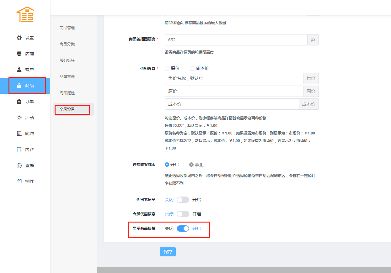 操作路径:后台 - 商品-全局设置- 显示商品售罄——点击开启