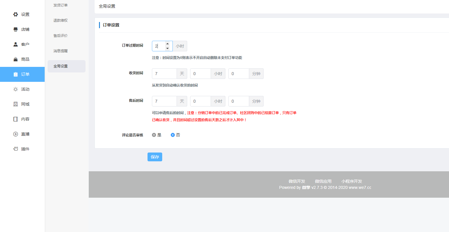延长自动确认收货时间的操作路径:后台-订单-全局设置。