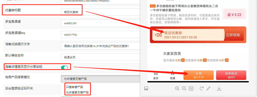 **后台可自定义优惠券标题,以及是否分享按钮,软件可采集有券有佣金或无券有佣金的产品**
