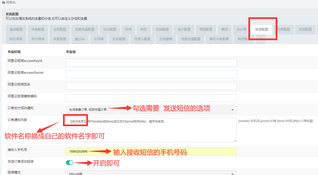 配置支付成功短信到账提醒,软件有手动充值的接口 可以配置短信到账提醒,有订单支付成功会有短信通知
