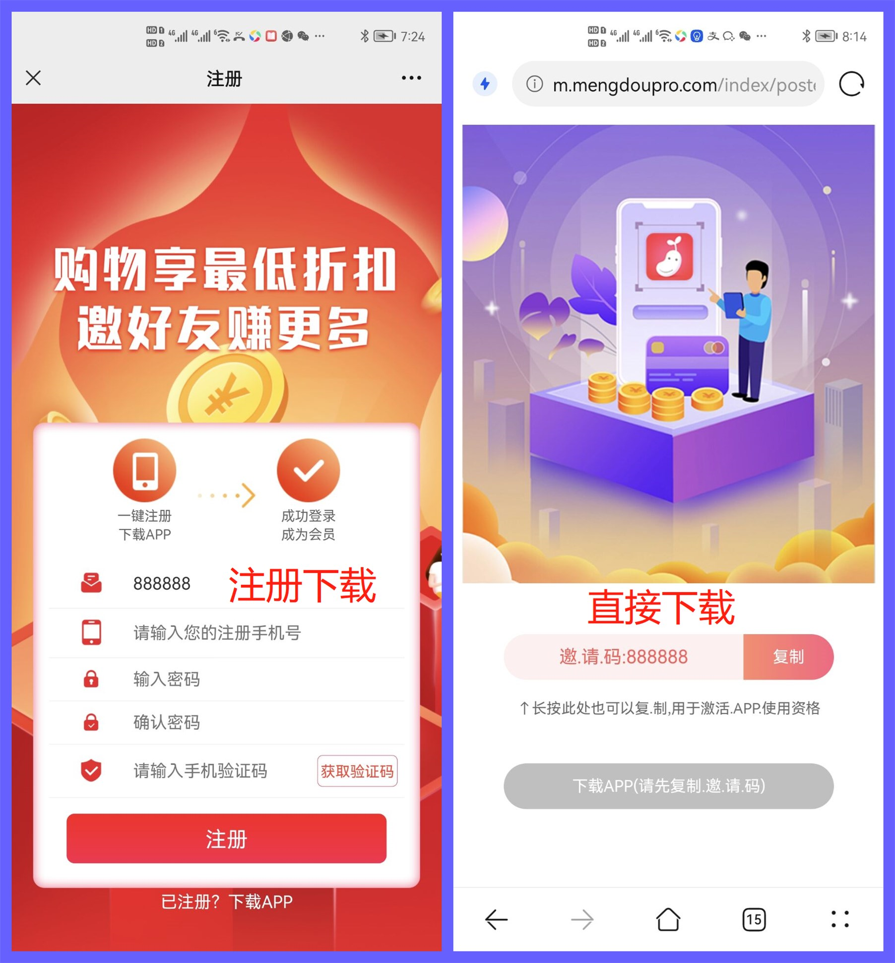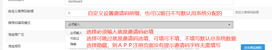 #### **自定义邀请码**,邀请码模式 可设置必填 可跳过 隐藏,选择隐藏则APP端注册不会出现邀请码字样