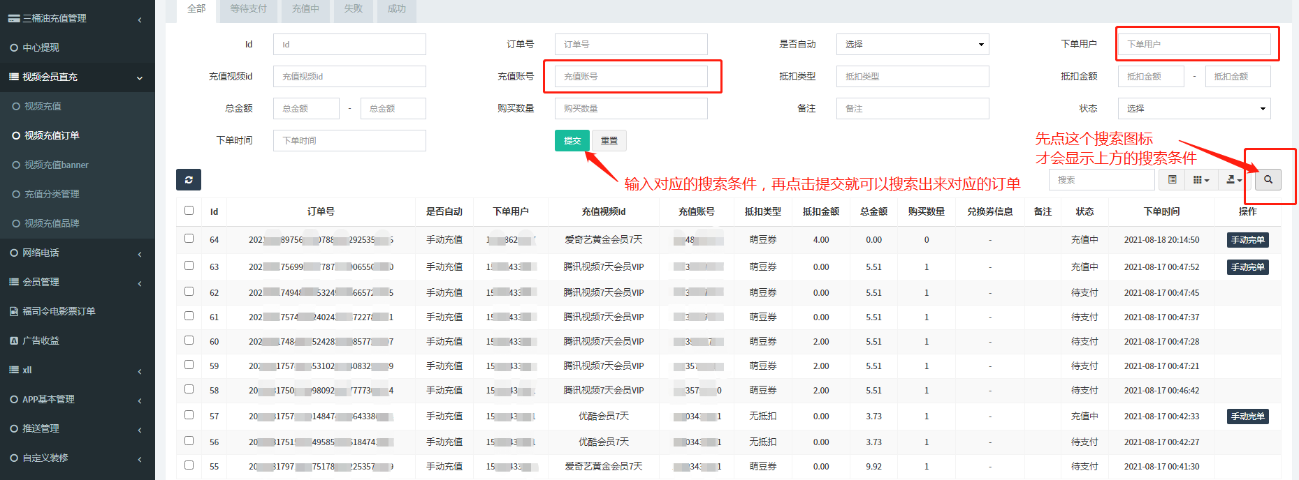 #### 视频充值订单里可以查询用户下单的视频充值产品订单