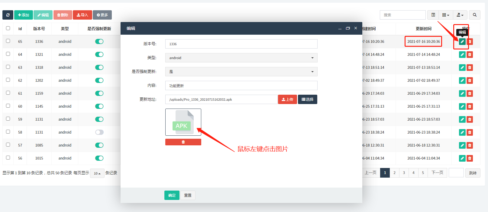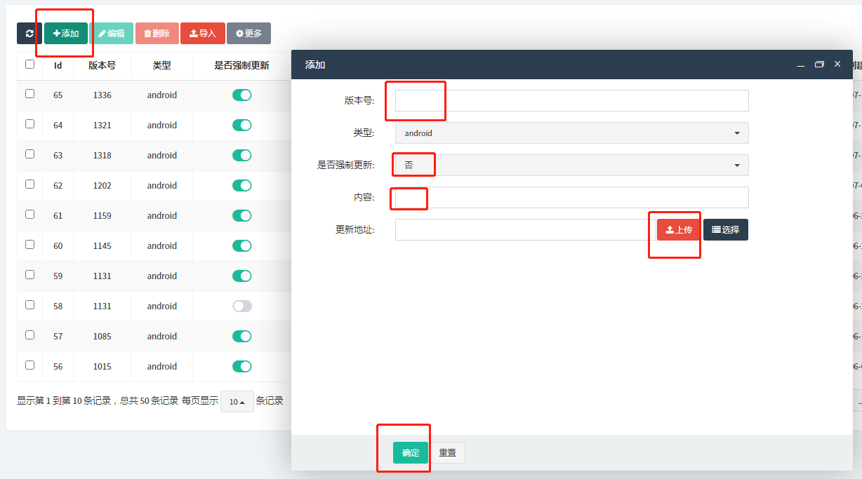 #### 点添加可以上传包,输入版本号,选择是否强制更新,输入更新的内容,上传文件点击确定即可