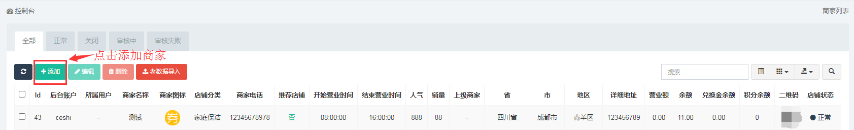 ### 商家列表:可进行添加商家,对商家进行编辑、删除