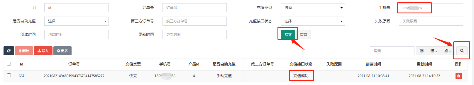 #### 若查询某一用户的订单是否充值成功,点右上角的搜索图标,上方会显示搜索条件,输入对应的手机号或订单号 点击提交,可以查询具体订单