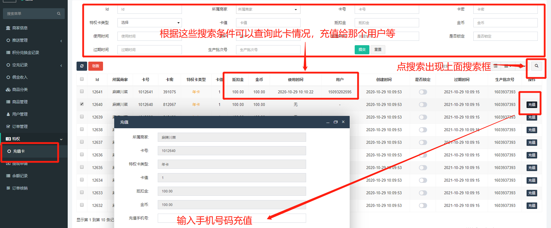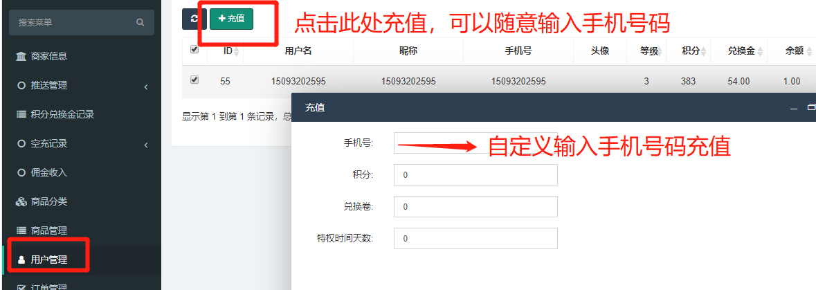 ## 用户管理,给本商家下面用户充值,或者是给其他号码空
