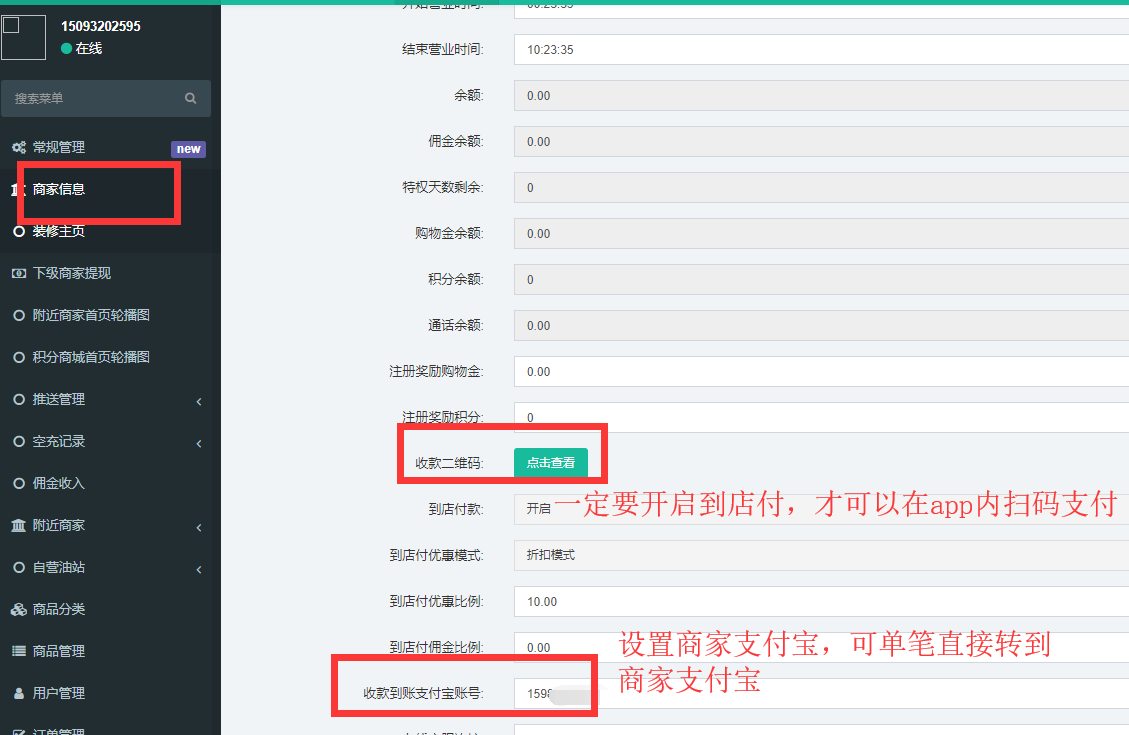 1.商家信息:点击查看商家收款二维码,设置支付宝到账二维码