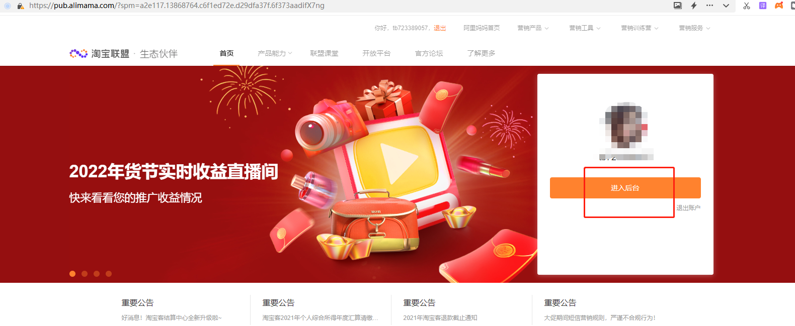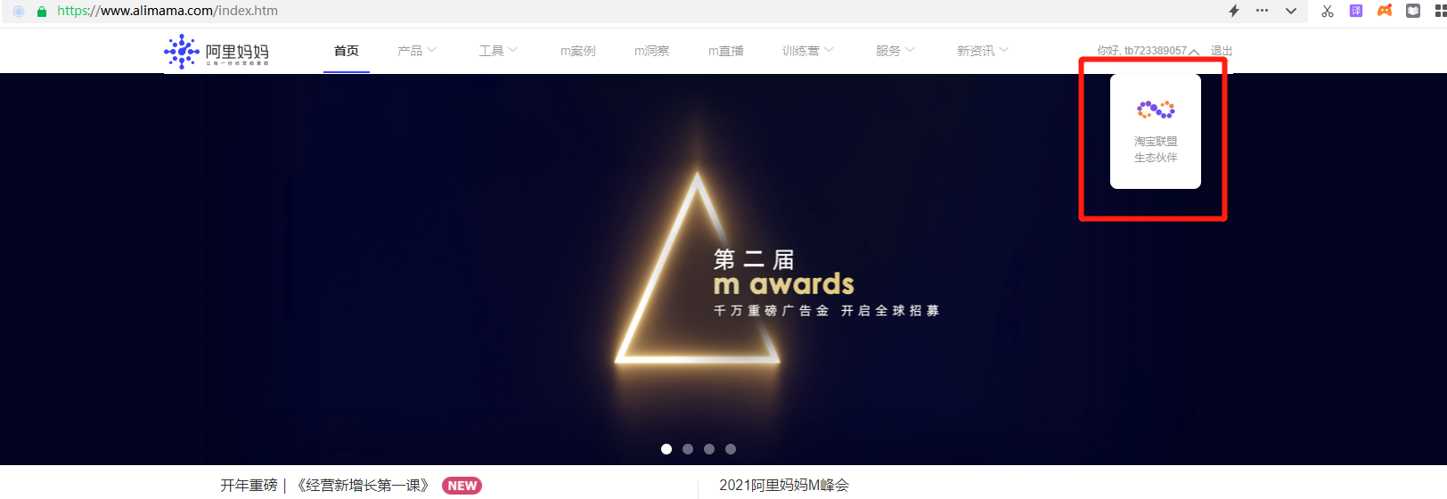 打开阿里妈妈网址登录用淘宝账号,登录成功 点击淘宝联盟